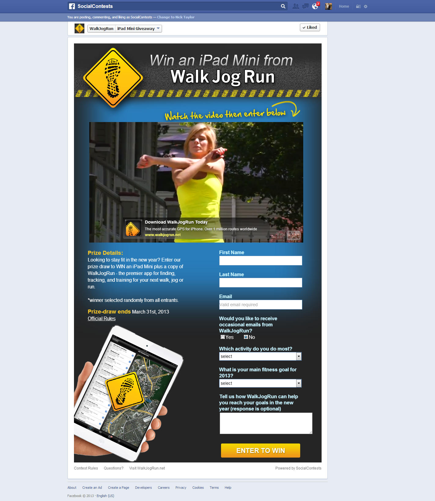 Social Contests worked with Walk Jog Run to incorporate all the features necessary to create a successful campaign that met their goals. A visually appealing contest showcasing Walk Jog Run’s new promotional video was created. Users were not only required to “like” Walk Jog Run on Facebook but they were also prompted to watch the video before entering. Social Contests also leveraged Walk Jog Run’s already existing email list. Using the email list with the incentivized sharing feature built in to the campaign allowed for an instant viral effect. A mobile optimized version of the campaign was an essential component as users were encouraged to download the iPhone app on the final page of the contest.